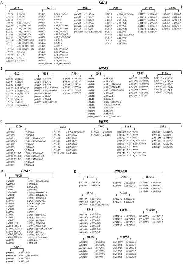 Figure 2: KRAS, NRAS, BRAF, EGFR and PIK3CA detectable mutations by PentaPanel platform. Comprehensive list of the 221 mutations covered by PentaPanel in KRAS A. NRAS B. EGFR C. BRAF D. and PIK3CA E. genes; for each hotspot codon both amino acid and nucleotide changes are shown.