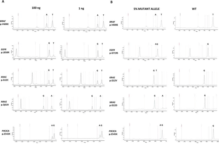 Figure 3: PentaPanel performance. A. Representative spectra of samples with high (100 ng) or low (1ng) DNA template input showing similar frequency of the detected mutations; B. Representative spectra of the sensitivity study showing positive calls for mutations at 5% dilutions.
