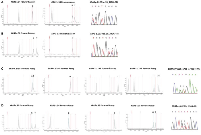 Figure 4: Spectra of bidirectional assays in representative complex mutations. A. KRAS nucleotide c.34, forward assay is WT and reverse assay shows a mutation call (G > T); KRAS p.G12C (c.33_34TG > CT) mutation, as shown by Sanger sequencing. Mutation not yet listed in the COSMIC database B. KRAS nucleotide c.38, forward assay shows a mutation call (G > T) and reverse assay is WT; KRAS p.G13V (c.38_39GC > TT) mutation, as shown by Sanger sequencing C. BRAF nucleotide c.1798, forward assay shows a mutation call (G > A) and reverse assay is WT; BRAF nucleotide c.1799, forward assay is WT and reverse assay shows a mutation call (T > A); BRAF p.V600K (c.1798_1799GT > AA) mutation, as shown by Sanger sequencing. D. KRAS nucleotide c.34, forward assay shows a mutation call (G > T) and reverse assay is WT; KRAS nucleotide c.35, forward assay is WT and reverse assay shows a mutation call (G > T); KRAS p.G12F (c.34_35GG > TT) mutation, as shown by Sanger sequencing. By using a single assay approach all these mutations could be missed, with false negative results.