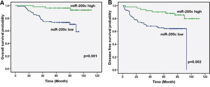 To explore the significance of miR-200c in clinical prognosis, we used Kaplan-Meier survival analysis to make patient overall survival (OS) and disease free survival (DFS) curves. The results demonstrated that patients with low miR-200c expression had shorter mean months of OS and DFS than patients with high expression (P = 0.001 for OS, P = 0.002 for DFS, Figure 2A and 2B). These results demonstrate that miR-200c expression is significantly associated with patient OS and DFS.