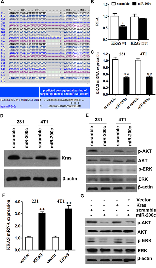 Figure 3: miR-200c inhibits the AKT and ERK pathways by targeting KRAS. A. miR-200c bound to the 3′-UTRs of KRAS. Predicted binding between miR-200c and the seeds matched in the 3′-UTRs of predicted genes. B. Luciferase assay of MDA-MB-231 and 4T1 cells cotransfected with miR-200c mimics, a scrambled control and a luciferase reporter containing KRAS 3′-UTR (KRAS-wt) or mutant constructs in which the first four nucleotides of the miR-200c binding site were mutated (KRAS-mut). All of the data are shown as the means ± s.e.m. *P < 0.05. C. MDA-MB-231 and 4T1 cells were transfected with miR-200c or scramble in control. miR-200c overexpression inhibited the KRAS mRNA expression. All of the data are shown as the means ± s.e.m. **P < 0.01. D. MDA-MB-231 and 4T1 cells were transfected with miR-200c or scramble in control. miR-200c overexpression inhibited the protein expression of KRAS. E. MDA-MB-231 and 4T1 cells were transfected with miR-200c or scramble in control. miR-200c overexpression inhibited the activity of AKT and ERK pathway. F. The transfection of KRAS was successful. All of the data are shown as the means ± s.e.m. **P < 0.01. G. miR-200c/scramble control transfection followed by KRAS/mock vector transfection 24 hours later in 4T1 cells affected AKT and ERK signalling. The protein expression levels of phosphorylated AKT (pAKT) and ERK (pERK) were measured to examine the activity of AKT and ERK pathways. The miR-200c-induced downregulation of KRAS was rescued by the introduction of KRAS. A similar alteration was observed in the phosphorylation levels of AKT and ERK.