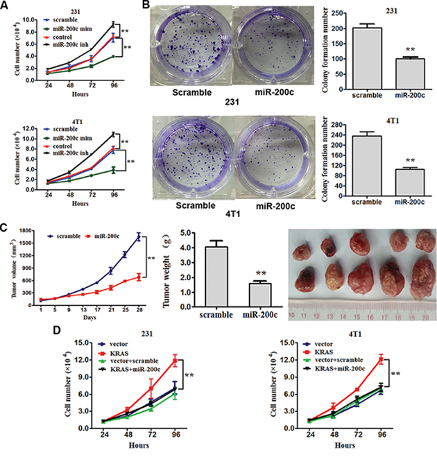 Figure 4: miR-200c inhibits the proliferation and clone formation of breast cancer by targeting KRAS. A. MDA-MB-231 and 4T1 cells were transfected withmiR-200c mimics, miR-200c inhibitors or their scrambled oligonucleotides controls. The proliferation of cells was assayed. All of the data are shown as the means ± s.e.m. **P < 0.01. B. MDA-MB-231 and 4T1 cells were transfected with scramble or miR-200c. Clone formation of cells was examined. Numbers of colonies are showed as the means ± s.e.m. **P < 0.01. C. Tumor growth in mouse xenograft models. 4T1 cells transfected with recombinant lentiviruses containing miR-200c precursor or scramble sequences were injected subcutaneously into BALC/c mice (five in each group). The tumor volume was measured every four days. After 28 days, the mice were killed, necropsies were performed, and the tumors were weighed. All of the data are shown as the means ± s.e.m. **P < 0.01. D. MDA-MB-231 and 4T1 cells were transfected with mock vector, scrambled oligonucleotides controls, KRAS-encoding vector + miR-200c or mock vector + scrambled oligonucleotides controls respectively. The proliferation of cells was assayed. All of the data are shown as the means ± s.e.m. **P < 0.01.