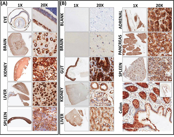 Figure 1: Constitutive expression and localization of RD3 in normal mouse and human tissues. A. Representative photomicrographs (1x and 20X) showing RD3 localization and expression in healthy mouse tissues. Tissue macroarray constructed with healthy mouse eye, brain, kidney, liver and spleen tissues coupled with automated IHC showing strong positivity of RD3 expression localized in perinuclear, cytoplasmic, and nuclear regions. B. RD3 localization and expression in normal human tissues. Corresponding section with no-primary antibody IHC(s) serves as the negative control. RD3 is ubiquitously expressed in in normal human brain, gut, kidney liver, pancreas, adrenal gland, spleen and colon tissues and highly localized in perinuclear regions, with some positivity in nuclear and cytoplasmic regions. Enlarged photomicrograph of colon depicts RD3 cellular localization.