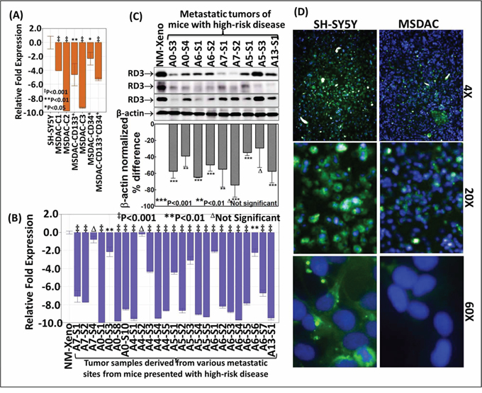 Figure 2: Transcriptional and translational loss of RD3 in high-risk aggressive neuroblastoma. A. Histograms from QPCR analysis showing complete suppression of RD3-transcription in the clones of CD34−CD133−, CD133+CD34−, CD133−CD34+ or CD133+CD34+ MSDACs grown ex vivo. B. RD3-QPCR analysis in the manifold of tumor tissues from metastatic high-risk aggressive disease and non-metastatic xenografts. Compared to the non-metastatic primary xenografts, RD3-transcription was completely suppressed in every metastatic tumor. C. Representative immunoblots showing marked loss of RD3 in tumor tissues from metastatic sites. RD3 loss was examined with antibody from three different sources. Densitometry analyses was performed using Quantity One Image analysis software and are compared using GraphPad PRISM software D. High-content confocal imaging showing the cellular localization (60X) and the variation in RD3 levels in parental SH-SY5Y and MSDACs. RD3 is lost in MSDACs. Cellular localization and expression of RD3 in SH-SY5Y and MSDACs were examined using Operetta high content and quantitative confocal imaging using Alexa Fluor 488 fluorochrome conjugated anti-mouse secondary antibodies. The nucleus was counter-labeled with DAPI. Plates were analyzed in Operetta with atleast eight fields/well and three wells/clone with a minimum of 21-Z planes. Unstained controls were included for both cell lines.