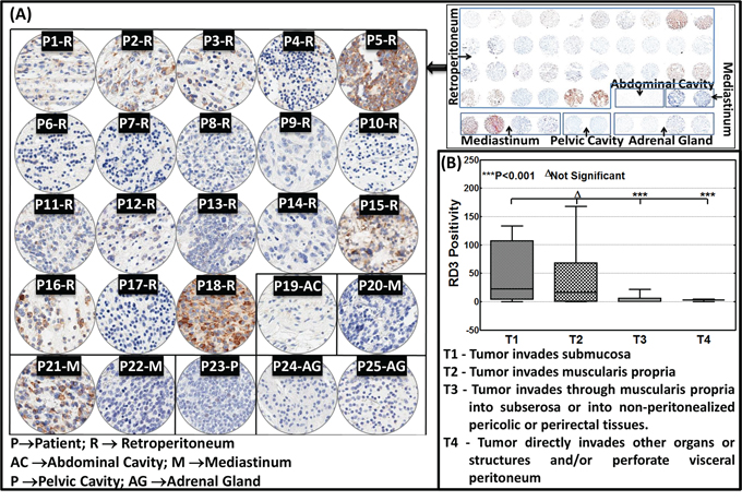 Figure 4: RD3 loss associates with the advanced tumor stage in neuroblastoma patients. A. Thumbnail and constructed images (20X) of human neuroblastoma TMA showing RD3 levels in neuroblastoma samples (n = 25). TMA comprising human neuroblastoma tissues derived from the retroperitoneal, abdominal, and pelvic cavities, the mediastinum, and the adrenal glands subjected to automated RD3-IHC analysis revealed a significant correlation of the RD3 positivity with its expression decreased per increased tumor invasive potential, with complete loss in highly invasive T4 tumors to the TNM stages. TNM classification includes: Tumor invades submucosa (T1, n = 5); Tumor invades muscularis propria (T2, n = 8); Tumor invades through muscularis propria into subserosa or into non-peritonealized pericolic or perirectal tissues (T3, n = 10), and; Tumor directly invades other organs or structures and/or perforates visceral peritoneum (T4, n = 2). B. Aperio TMA image analysis of RD3 positivity identifies significant correlation of RD3 expression with TNM disease stage. Group-wise comparisons were performed with one-way ANOVA using GraphPad Prism.