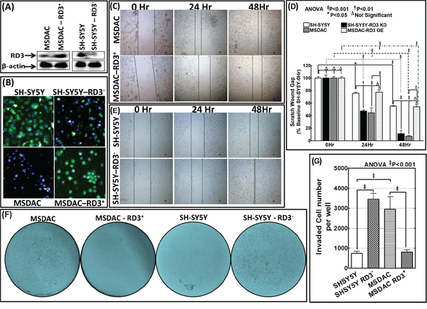 Next, matrigel invasion assay recognized the robust metastatic potential of MSDACs with significant number of cells invading (Figure 5F). Compared to human SH-SY5Y cell, this increase in invasiveness of MSDACs remained statistically significant (Figure 5G). Conversely re-expressing RD3 significantly (P < 0.001) delimited MSDACs’ invasion potential (Figure 5F & 5G) and levels with SH-SY5Y invasiveness capacity. On the other hand, silencing RD3 in SH-SY5Y cells profoundly (P < 0.001) enhances their invasive potential (Figure 5F) and parallels with the MSDACs invasiveness (Figure 5G).
