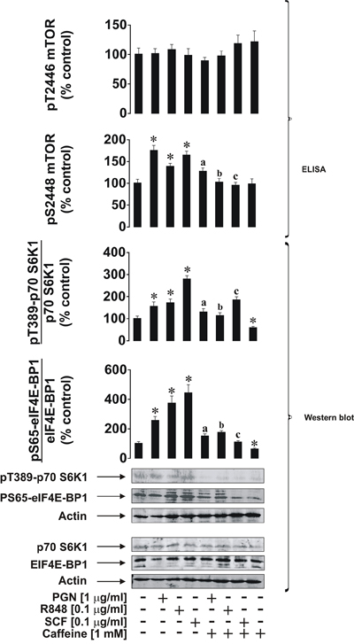 Figure 1: Caffeine inhibits the ligand-induced mTOR signalling pathway in THP-1 human acute myeloid leukaemia cells. Cells were exposed for 4 h to the indicated concentrations of PGN, R848 or SCF with or without 1 h pre-treatment with 1 mM caffeine. Levels of pS2448 and pT2446 phospho-mTOR as well as phosphorylation of its downstream enzymes were analysed as outlined in the Materials and Methods. Western blot data show one representative experiment of four that gave similar results and were quantitatively analysed. Quantitative data are shown as means ± S.D; * – p < 0.01 vs. control (n = 4), a – p < 0.01 vs. PGN alone, b – p < 0.01 vs. R848 alone and c – p < 0.01 vs. SCF alone.