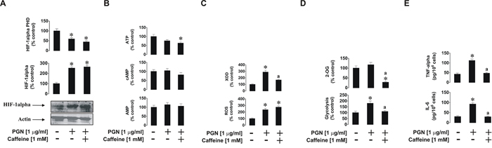 Figure 2: Effects of caffeine on TLR2-mediated biological responses of THP-1 cells. Cells were exposed for 4 h to PGN with or without 1 h pre-treatment with 1 mM caffeine before assessing the indicated biological responses: A. HIF-1α accumulation, B. ATP/cAMP/AMP levels, C. XOD activity and intracellular ROS pool, D. glycolysis and 2-OG level as well as E. TNF-α/IL-6 release. Western blot data show one representative experiment of three that gave similar results. Quantitative data are shown as means ± S.D; * – p < 0.01 vs. control (n = 3), a – p < 0.01 vs. PGN alone.