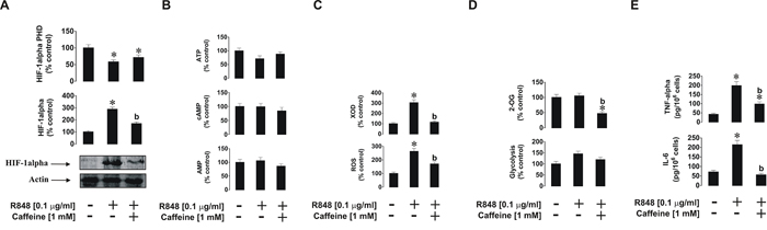 Figure 3: Effects of caffeine on TLR7/8-mediated biological responses of THP-1 cells. Cells were exposed for 4 h to R848 with or without 1 h pre-treatment with 1 mM caffeine before analysing A. HIF-1α accumulation, B. ATP/cAMP/AMP levels, C. XOD activity and intracellular ROS pool, D. glycolysis and 2-OG level as well as E. TNF-α/IL-6 release. Western blot data show one representative experiment of three that gave similar results. Quantitative data are shown as means ± S.D; * – p < 0.01 vs. control (n = 3), b – p < 0.01 vs. R848 alone.