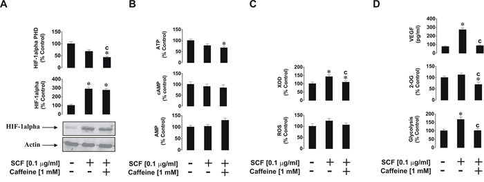 Figure 4: Effects of caffeine on SCF-induced Kit receptor activation in-THP-1 cells. Cells were exposed for 4 h to SCF with or without 1 h pre-treatment with 1 mM caffeine before analysing A. HIF-1α accumulation, B. ATP/cAMP/AMP levels, C. XOD activity and intracellular ROS pool, D. glycolysis and 2-OG level as well as VEGF release. Western blot data show one representative experiment of three that gave similar results. Quantitative data are shown as means ± S.D; * – p < 0.01 vs. control (n = 3), c – p < 0.01 vs. SCF alone.