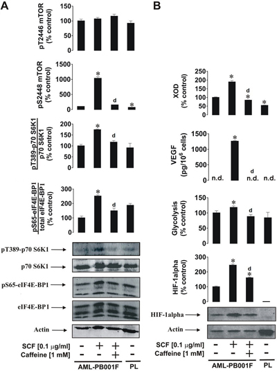 Figure 6: Effects of caffeine on SCF-induced Kit receptor activation in primary human AML cells. AML-PB001F cells were exposed for 4 h to SCF with or without 1 h pre-treatment with 1 mM caffeine before analysis of A. mTOR phosphorylation and its biological activity and B. HIF-1α accumulation, glycolysis, VEGF release and XOD activity. Western blot data (50,000 cells per well were loaded in each case for AML cells and 90,000 for healthy primary leucocytes) show one representative experiment of three-four (using cells derived from different donors) that gave similar results. In both panels A and B we also show the results obtained from non-treated healthy primary human leukocytes (PL) handled as described in Materials and Methods. Quantitative data are shown as means ± S.D; * – p < 0.01 vs. control (n = 4 for panel A and n = 3 for panel B), d – p < 0.01 vs. SCF alone.