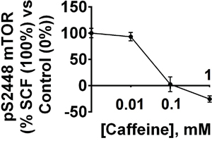Given the effects of caffeine on AML cell function, we next determined the concentration-dependent actions of caffeine on these cells following exposure to 0.1 μg/ml SCF for 4 h with or without 1 h pre-treatment with 0.01, 0.1 and 1 mM caffeine. Levels of pS2448 mTOR were monitored as a biochemical response. We found that SCF-dependent mTOR phosphorylation was significantly affected by 1 and 0.1 but not 0.01 mM caffeine (Figure 7).