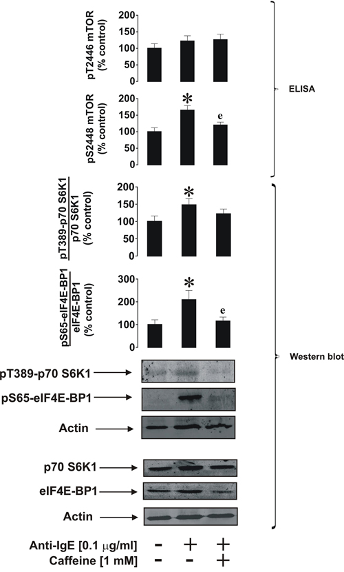 Figure 8: Caffeine inhibits ligand-induced mTOR signalling pathway in primary human basophils. Cells were exposed for 2 h to 0.1 μg/ml anti-IgE with or without 30 min pre-treatment with 1 mM caffeine. pS2448 and pT2446 phospho-mTOR levels as well as phosphorylation of its downstream enzymes were analysed as described in Materials and Methods. Western blot data show one representative experiment of four that gave similar results. Quantitative data are shown as means ± S.D; * – p < 0.01 vs. control (n = 4), e – p < 0.01 vs. anti-IgE alone.