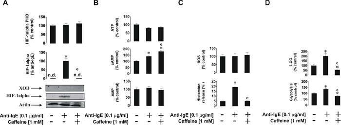 Figure 9: Effects of caffeine on the anti-IgE-induced biological responses of primary human basophils. Cells were exposed for 2 h to 0.1 μg/ml anti-IgE with or without 30 min pre-treatment with 1 mM caffeine before analysis of A. HIF-1α accumulation and XOD protein levels, B. ATP/cAMP/AMP levels, C. intracellular ROS pool and histamine release, D. glycolysis and 2-OG level. Western blot data show one representative experiment of three that gave similar results. Quantitative data are shown as means ± S.D; * – p < 0.01 vs. control (n = 3), e – p < 0.01 vs. anti-IgE alone.