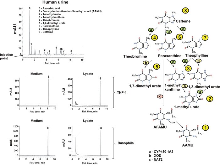Figure 10: Determination of caffeine and its metabolites in human urine and myeloid cells. Caffeine and its metabolites in human urine (coffee drinkers) and medium/lysates of THP-1 cells (exposed for 4 h to 1 mM caffeine) and human basophils (exposed for 2 h to 1 mM caffeine) were detected by HPLC. The caffeine metabolic pathway in humans is also presented indicating how each metabolite is obtained biochemically. CYP4501A – cytochrome P450 A2; XOD – xanthine oxidase; NAT2 – N-acetyltransferase 2; AAMU – 5 Acetylamino-6-amino-3-methyluracil; AFMU – 5 Acetylamino-6-formylamino-3-methyluracil.