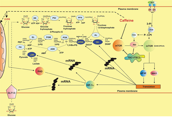 Figure 11: Possible biochemical mechanisms of the effects of caffeine on the mTOR pathway, HIF-1 activity and energy metabolism in human myeloid cells (SCF-induced responses are used as the example). Additional abbreviations used: HK – hexokinase, PGI – phosphoglucose isomerase, PFK – phosphofructokinase, AL – Aldolase, TPI – Triose-phosphate isomerase, GPDH – glyceraldehyde-3-phosphate dehydrogenase, PGK – phosphoglycerate kinase, PGM – phosphoglycerate mutase, EL – enolase, PK – pyruvate kinase, LDH – lactate dehydrogenase, DHAP – dihydroxyacetone phosphate, GA3-P – glyceraldehyde-3-phosphate, 3-PG – 3-phosphoglycerate, 2-PG – 2-phosphoglycerate, PEP – phosphoenolpyruvate, GLT1/3 – glucose transporters 1/3, TSC1/TSC2 – Tuberous sclerosis proteins 1 and 2, PDK – P-3-PI-dependent kinase, ADK – adenylate kinase, TK – tyrosine kinase.