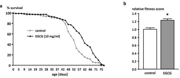 Figure 1: Effect of EGCG (10 mg/ml) supplementation on lifespan in male W1118 Drosophila melanogaster. a. One representative experiment out of two is shown. n = 120 flies per group, p < 0.05 log-rank test. b. Relative fitness levels of male W1118 Drosophila melanogaster reared on an EGCG (10 mg/ml)-supplemented diet for 30 days. The data are expressed as the mean + SEM (n = 100). * indicates significant differences compared to the control group (p < 0.05, Student's t-test).