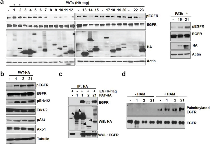 Figure 3: PAT 1, 2 and 21 increases EGFR activation and palmitoylation. a. Screening of PAT enzymes for EGFR activation. A549 cells were transfected with individual PAT (HA-tagged) constructs for 24 hours followed by 12 hours of serum starvation. Isolated protein samples were tested for EGFR activation using pEGFR antibody. b. Western blot analysis of protein samples for pEGFR, EGFR, pAkt, Akt, pErk 1/2, Erk 1/2 and Actin isolated from A549 cells transfected with PAT plasmids 1, 2, 21 or vector alone for 24 hours followed by serum starvation for 12 hours. c. Western blot analysis of immunoprecipitated samples for HA and EGFR antibodies. HEK 293 cells were transfected with EGFR-flag alone or in combination with indicated PATs as shown in the Figure 3c and PAT enzymes were immunoprecipitated with HA antibody. d. Western blotting analysis of palmitoylated EGFR from PC3 cells transfected with vector alone or PATs.