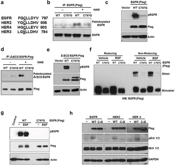 Figure 4: C797 site is conserved in kinase active ErbB members and is important for constitutive activation and palmitoylation of EGFR. a. Comparison of palmitoylation site (C797) of EGFR with HER2, HER3 and HER4. b. Western blotting analysis for palmitoylated EGFR prepared from HEK293 cells transfected with EGFR WT or C797G mutant (Flag-tagged). c. C797G mutation blocks EGFR constitutive phosphorylation when expressed in HEK 293 cells. d. C797G mutation blocks palmitoylation of ΔECD EGFR in HEK 293 cells. e. C797G mutation blocks ΔECD EGFR constitutive phosphorylation in HEK 293 cells. f. HEK 293 cells were transfected with WT or C797G EGFR for 24 hours and treated with DMSO or EGF at 10 ng/ml for 20 minutes and protein samples were analyzed for EGFR dimers using Western blotting under reducing or non-reducing conditions. g. The same samples from panel f were subjected to Western blot analysis. h. Western blot analysis for Flag, pErk 1/2, Erk 1/2 and GAPDH. Protein samples were prepared from HEK 293 cells transfected with WT or cysteine mutants of ErbB members.
