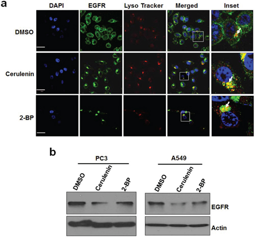 Figure 5: Inhibition of de novo fatty acid synthesis or palmitoylation alters EGFR cellular distribution and reduces total EGFR levels. a. Representative immuno fluorescent images of PC3 cells. PC3 cells were treated with DMSO or cerulenin at 5 ug/ml for 24 hours and stained for EGFR (green), lysosomes (red) and nucleus (DAPI, blue). Images were taken using Olympus confocal microscope using 60x objective. Scale bar is 30um. b. Western blot analysis of protein samples for EGFR and Actin isolated from PC3 cells and A549 cells treated with FASN inhibitor, cerulenin at 5ug/ml or 2-BP (6 uM) for 24 hours.