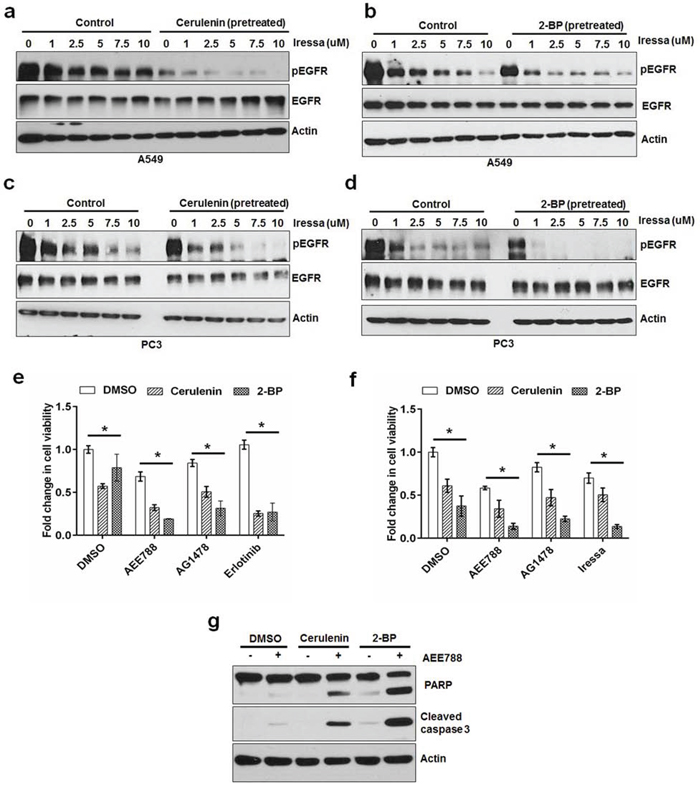 Knowing that EGFR's palmitoylation plays a critical role in its function, we sought to test whether inhibition of FASN or PATs activity can increase the sensitivity of cancer cells to EGFR tyrosine kinase inhibitors (EGFR TKI). We treated A549 and PC3 cells with increasing concentrations of EGFR TKI, Iressa, (1 uM to 10 uM) for 30 minutes in the presence or absence of cerulenin or 2-BP (pretreated for 3 hours). In the presence of cerulenin or 2-BP, Iressa showed an increased efficacy in inhibiting EGFR phosphorylation at every concentration compared with that of control (Figure 6a–6d). Consistently, inhibition of FASN or PATs significantly increased the sensitivity of PC3 and A549 cells to the growth inhibitory effects of EGFR kinase inhibitors (Figure 6e and 6f). In addition to the growth inhibitory effects, cerulenin and 2-BP treatment increased the pro-apoptotic effects of AEE788 as evidenced by increased levels of cleaved PARP and caspase 3 (Figure 6g). These results indicate that the de novo fatty acid synthesis dependent palmitoylation plays a critical role in maintenance of cancer cell survival under EGFR TKI treatment.