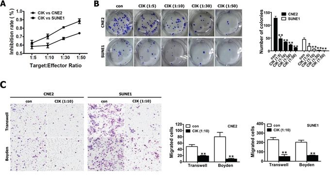 Figure 1: Evaluation of the in vitro cytotoxicity of CIK cells. A. The proliferation ability of CNE2 and SUNE1 cells treated with CIK cells were analyzed by CCK8 assay. B. Colony formation assay for CNE2 and SUNE1 cells treated with CIK cells. C. NPC cells treated with CIK cells exhibited the reduced motility and invasion. The motility and invasion of CNE2 and SUNE1 cells were analyzed with an in vitro migration assay using a transwell chamber and an in vitro invasion assay using a matrigel-coated Boyden chamber, respectively. The migrated cells were plotted as the average number of cells per field of view from 3 different experiments, as described in the materials and methods section.