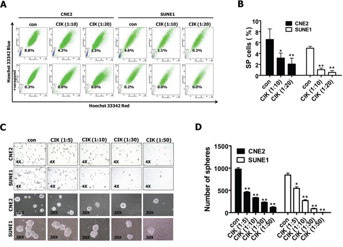 Side populations (SPs) among NPC cells and tumorspheres have been reported to exhibit CSC characteristics [24–27]. We first tested the effects of CIK cell treatment on the percentages of SP cells in CNE2 and SUNE1 cells, and found that CIK cell treatment dramatically decreased the percentage of SP cells in CNE2 and SUNE1 cells (Fig. 2A). This data was confirmed on several occasions, and found to be statistically significant (Fig. 2B). Taken together, our results demonstrate that CIK cell treatment can remarkably reduce the cancer stem cell-like SPs in NPC cells.