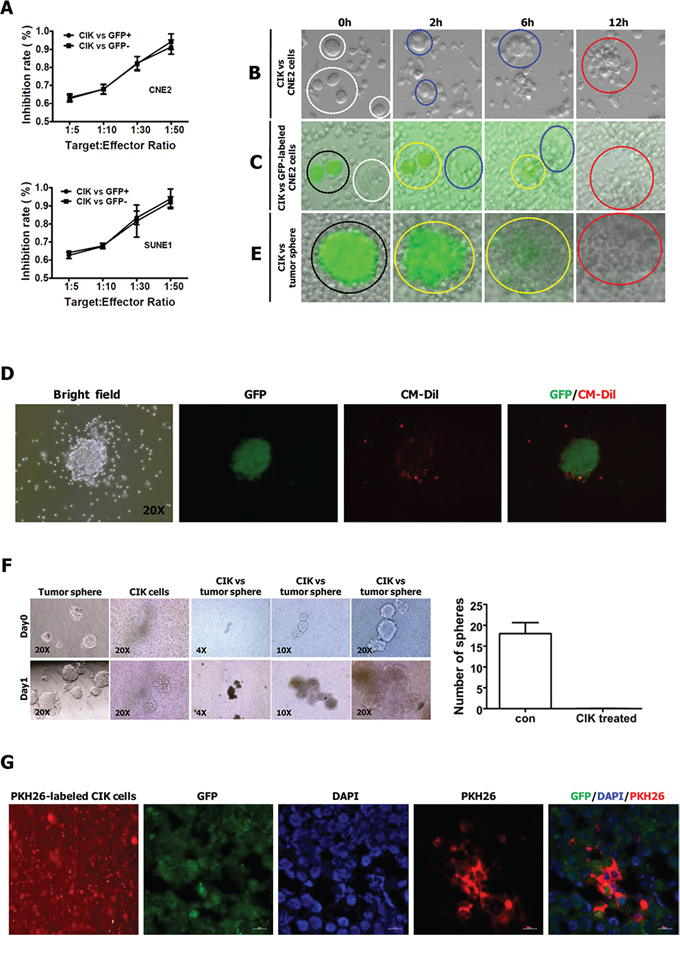 Figure 4: CIK cells have direct killing effect on stem-like cancer cells of NPC. A. The antitumor activity of CIK cells was equally intense against GFP+ and GFP- NPC cells. B. Time-lapse imaging (see supplemental Movie 1) used to observe the interactions between CNE2 cells and CIK cells. C. Time-lapse imaging (see supplemental Movie 2) used to observe the interactions between CNE2 cells (harboring PNanog-GFP-T2A-Luc transgene) and CIK cells. D. Representative pictures of GFP+ tumor sphere surrounded by CM-Dil-labeled CIK cells. GFP+ tumor sphere was generated from GFP+ cells sorted from CNE2 cells harboring PNanog-GFP-T2A-Luc transgene. Red fluorescent dye CM-Dil was used to label CIK cells. E. Time-lapse imaging (see supplemental Movie 5) used to observe the interactions between GFP+ tumor sphere (derived from GFP+ cells sorted from CNE2 cells harboring PNanog-GFP-T2A-Luc transgene) and CIK cells. The explanations of the Figure 4B, 4C, 4E are presented in figure legends of Supplemental Movies. F. CIK cells efficiently killed tumor spheres derived from CNE2 cells. Representative pictures of sphere are shown in the left panels, and the number of spheres is shown in the right panels. G. Infiltration of PKH26-labeled CIK cells surrounding GFP+ stem-like cancer cells was shown by red fluorescent at frozen tissue section. GFP+ cells sorted from CNE2 cells harboring PNanog-GFP-T2A-Luc transgene were subcutaneously injected into the dorsal thigh of NOD/SCID mice. After implanted tumor formed, CIK cells labeled with red fluorescent dye PKH26 were injected intravenously once a day. 3 days after PKH26-labeled CIK cell implantation, mice were sacrificed, and tumors were dissected, followed by frozen section.