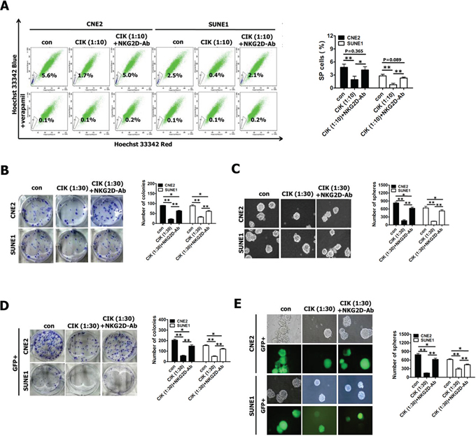 Figure 5: Blocking of NKG2D with antibody significantly reduced tumor killing activity of CIK cells against putative CSCs. A–C. The percentages of SP cells (A), colony formation assay (B) and tumor sphere formation assay (C) in CNE2 and SUNE1 cells treated with CIK cells alone and CIK cells which were pre-incubated with anti-NKG2D antibody for 30 min. D–E. Colony formation assay (D) and tumor sphere formation assay (E) of GFP+ cells (sorted from CNE2 and SUNE1 cells harboring PNanog-GFP-T2A-Luc transgene) treated with CIK cells alone and CIK cells which were pre-incubated with anti-NKG2D antibody for 30 min.