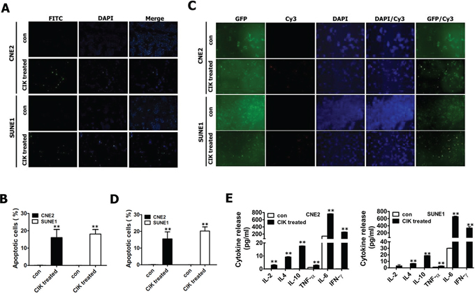 Figure 6: CIK cells efficiently killed NPC cells (including putative CSCs) through the induction of apoptosis and secretion of immune cytokines. A–B. CIK-treated CNE2 and SUNE1 cells exhibited significantly increased apoptotic cells detected by TUNEL staining. C–D. CIK-treated GFP+ CNE2 and SUNE1 cells showed significantly enhanced apoptotic cells assayed by TUNEL staining. After CNE2 and SUNE1 cells (A-B) or GFP+ fractions sorted from CNE2 and SUNE1 cells carrying PNanog-GFP-T2A-Luc transgene by FACS (C-D) were co-cultured with CIK cells for 24 h, cancer cells were washed three or four times with PBS to fully remove suspended CIK cells, followed by TUNEL staining to detect cells undergoing apoptosis. The FITC-conjugated green signal (A) and Cy3-conjugated red signal (C) showed the presence of TUNEL-positive cells. DAPI (blue) is used as nuclear counterstain. E. The concentrations of IL-2, IL-4, IL-6, IL-10, TNF-α and IFN-γ in 24 h co-culture supernatant were detected by ELISA.