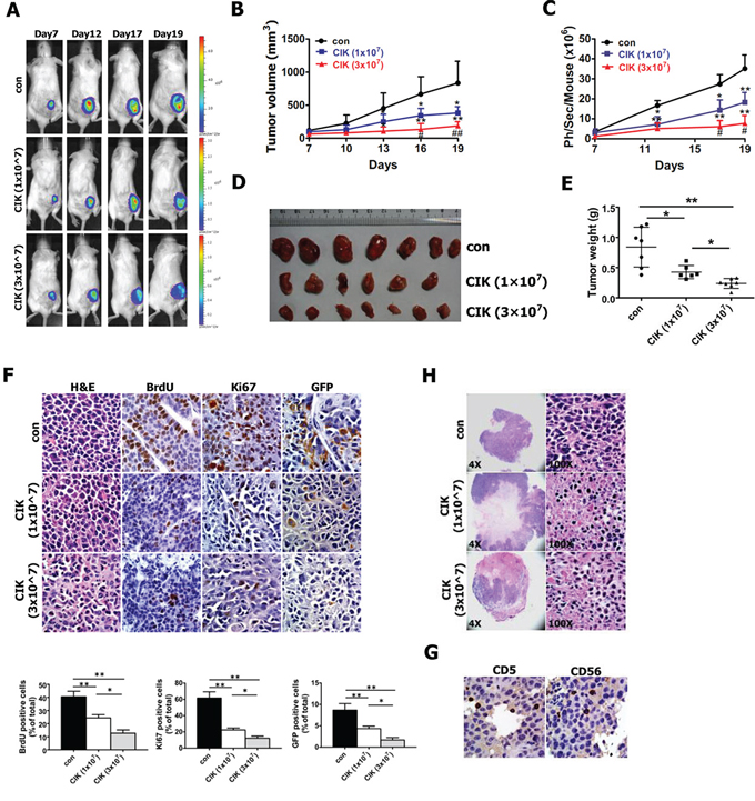 Figure 7: In vivo activity of CIK cells against CNE2 cells harboring GFP-T2A-Luc in NOD/SCID mice. As mentioned in Materials and methods section, NOD/SCID mice were subcutaneously implanted with 1 × 106 CNE2 cells harboring PNanog-GFP-T2A-Luc transgene. 7 days after tumor cell implantation, 1 × 107 and 3 × 107 CIK cells were infused by tail vein injection into recipient mice once every two days. A. Series of in vivo bioluminescence images (taken at the indicated times) of 3 representative NOD/SCID mice from CIK- (1 × 107), CIK- (3 × 107) and vehicle-treated groups before and after CIK cell treatment. B. Growth curve of tumor volumes. C. Quantification analysis of bioluminescence signal of tumor-bearing mice treated with CIK cells (1 × 107 and 3 × 107) or with vehicle control. D. Representative picture of tumors formed. E. Tumors were weighted. F. BrdU, Ki67 and GFP-stained sections of transplanted tumors formed by CNE2 cells at 19 days after subcutaneous transplantation. The percentages of BrdU-, Ki67- or GFP-positive cancer cells were calculated by the total number of BrdU-, Ki67- or GFP-positive cells over total number of cancer cells. G. Infiltration of CIK cells at tumor sites was shown by immunohistochemistry (Ab anti-CD5 and Ab anti-CD56) at the end of experiment. H. A significant increase in transplanted tumor tissue necrosis and apoptosis was observed in CIK-treated mice compared with controls at the end of the experiment.