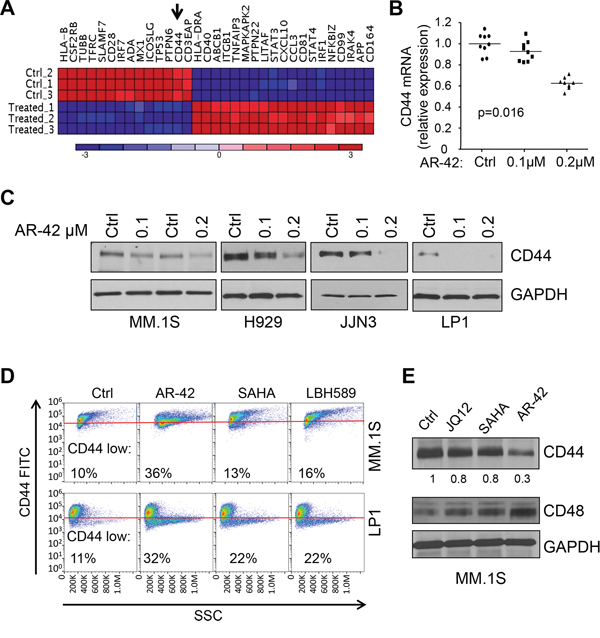 Figure 1: AR-42 treatment induces CD44 downregulation in multiple myeloma cell lines. A. Dendrogram of the unsupervised hierarchical clustering analysis of nCounter® GX Human Immunology assays in MM.1S cells treated with 0.1 μM AR-42 for 24 hrs. B. CD44 mRNA expression measured by qRT-PCR in RNA from MM.1S cells treated for 24 hrs with 0.1, or 0.2 μM AR-42. GAPDH was used for normalization. C. CD44 protein expression in MM.1S, H929, JJN3 and LP1 cells treated with AR42 at 0.1 and 0.2 μM, or vehicle control (Ctrl) for 24 h. GAPDH was used as a loading control. D. Flow cytometric analyses of the CD44 expression in MM.1S and LP1 cells upon 24 h treatment with AR42 (0.2 μM), SAHA (1 μM) and LBH589 (LBH; 0.01 μM). Events expressing low level of CD44 are shown as % of the total events. All experiments were performed in triplicate. E. MM.1S cells were treated with different HDACi's (0.5 μM JQ12, 1 μM SAHA, or 0.2 μM AR-42), or vehicle control (Ctrl) for 48 hrs and analyzed by western blot for the levels of CD44 protein. The same blot was also stained with anti-CD48 antibody and the results were normalized to GAPDH.