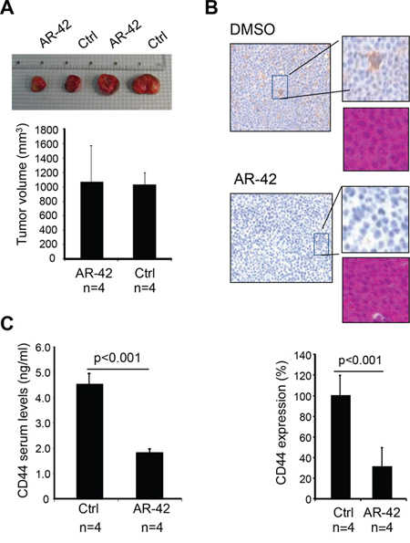 To investigate if AR-42 treatment could affect CD44 expression in vivo, we created a xenograft MM mouse model by injecting 1 × 107 viable cells of MM.1S cell line subcutaneously into the right flank of 12 NOD-SCID mice. Three weeks later, a group of 8 mice containing comparable tumor size (250 ± 60 mm3) were selected and randomly divided into 2 groups. One group of mice (n = 4) received intra-peritoneal injections of 25 mg/kg AR-42, while the second group (n = 4) was injected with vehicle control (8% DMSO in PBS; Ctrl). Injections were administered once a day (on Monday and Wednesday). Because the anti-tumor activity of AR-42 has been previously reported in preclinical mouse studies [33], in order to avoid tumor size reduction mice were sacrificed 2 days after the second injection. Indeed, at this time point the tumors were still comparable between the mouse groups (Figure 2A). Tumors were excised and used for CD44 immunohistochemical (IHC) studies, while the serum was collected for ELISA assays. IHC analysis of tumor sections revealed that the AR-42-treated mice displayed significant lower CD44 staining compared with the control group (Figure 2B). ELISA assays also showed decreased levels of soluble CD44 in the serum of the mice treated with AR-42 (Figure 2C). In conclusion, our data demonstrate that AR-42 is able to down-regulate CD44 directly in vivo.