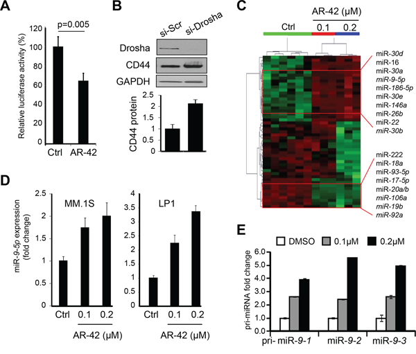 Figure 3: AR-42 upregulates expression of miR-9-5p. A. Luciferase assay in MM.1S cells transiently transfected with pGL3-CD44 3′UTR construct and treated for 24 hrs with 0.2 μM AR-42, or vehicle control (Ctrl) showing inhibitory response to AR-42 via 3′UTR element. Each measurement was done in triplicate. B. MM.1S cells were treated with RNA silencing for Drosha (si-Drosha) or unrelated sequence (si-Scr). Forty eight hours later, cells were lysed and analyzed by western blot using anti-Drosha and anti-CD44 antibodies. GAPDH was used for normalization. Signals were quantified using ImageJ and plotted below. C. Dendrogram of the unsupervised hierarchical clustering analysis of global miRNA expression in MM.1S cells treated with designated concentrations of AR-42, or vehicle control (Ctrl), using NanoString technology. Selected most up-regulated (upper) and down-regulated (lower) miRNAs are indicated. D. miR-9-5p expression in MM.1S (left) and LP1 (right) cells treated with AR-42 at 0.1 and 0.2 μM, or vehicle control (Ctrl) was determined by qRT-PCR. Results are expressed as fold change compared to the DMSO (Ctrl). E. The effect of 24-hr treatment of MM.1S cells with AR-42 (at indicated concentrations) on expression of pri-miR-9-1, pri-miR-9-2 and pri-miR-9-3 was determined by qRT-PCR.