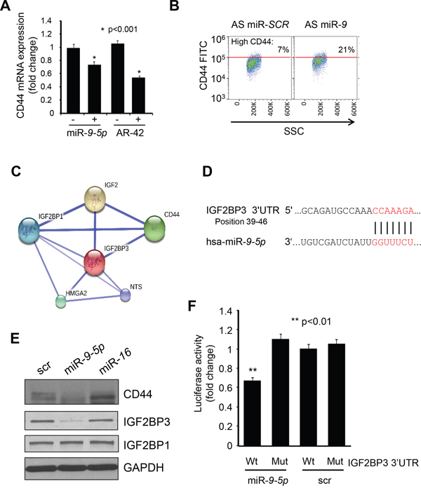 The CD44 mRNA binding protein IG2FBP3 is the direct target of miR-9-5p