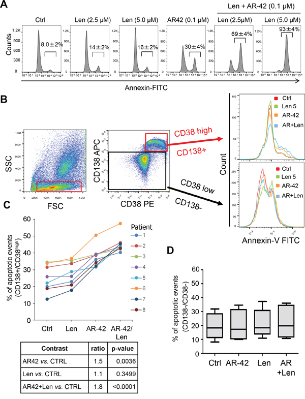 Figure 5: The effect of combined AR-42 and lenalidomide treatment in MM cell lines and primary MM patient bone marrow-derived cells. A. Annexin V expression by flow cytometry in MM.1S cells treated twice (every 24 hours), with Len (2.5, or 5.0 μM), AR-42 (0.1 μM), or combination Len+AR-42, as indicated. Values represent the average percentages of positive events ± SD from three independent experiments. B. Strategy of analysis of apoptosis by flow cytometry in bone marrow samples. Bone marrow cells from 5 Len-refractory and 3 newly diagnosed MM patients were stained with anti-CD138 and anti-CD38 antibodies and sorted into 2 populations: CD38high/CD138+ (MM plasma cells) and CD38low/CD138-. Each population was further divided and treated with vehicle control (Ctrl), 5 μM Len, 0.25 μM AR-42, a combination of both drugs for 48 hrs, followed by flow cytometric Annexin V apoptosis assay. C. Annexin-V induction in CD38high/CD138+ MM cells treated as described in (B) Data are expressed as % of Annexin V positive events. D. Flow cytometric evaluation of apoptosis in CD38low/CD138- BM population from the same MM patients, as in (C) Data are expressed as % of Annexin V positive events.