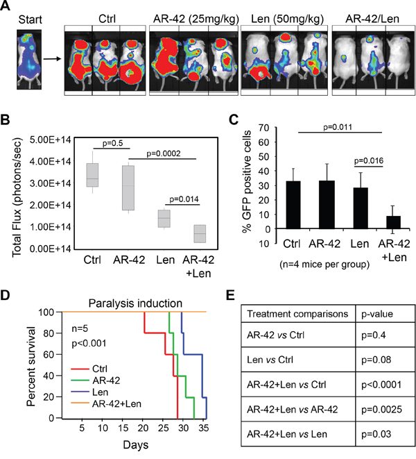 Figure 6: Synergistic effect of AR-42 and lenalidomide combination therapy in vivo. A. NOD-SCID mice engrafted with 5 × 106 MM.1S GFP+/Luc+ cells and treated for 3 weeks with vehicle control (Ctrl), AR-42, lenalidomide (Len), or AR-42/Len combination. Representative luminescence images are shown. B. Tumor progression was evaluated by bioluminescence imaging, which showed that the tumor growth was markedly suppressed in AR-42+Len treated mice, compared to control group (Ctrl), or single agent treated mice. C. Analysis of murine BM tumor progression by CD138-GFP+ quantification by flow cytometry. Data represent the mean ± SD of each group of treatment. D. Kaplan-Meier survival curves for mice in each group of treatments. Comparison between the different groups of treatments was made p-values associated with survival are shown in E.