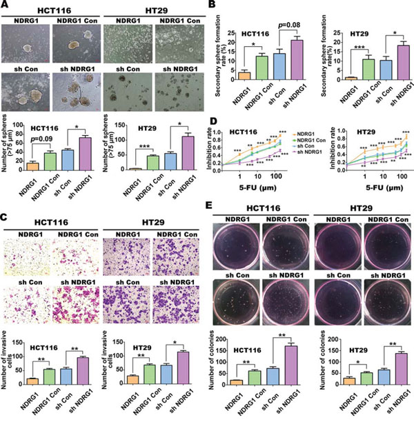 Figure 1: NDRG1 inhibits CSC-related phenotypes and tumorigenesis in CRC cells (HCT116 or HT29) with NDRG1 over-expression or silencing. A. Comparison of sphere formation between HCT116 or HT29 cell-types with either NDRG1 over-expression (i.e., NDRG1 vs. “NDRG1 Con” [vector control]) or NDRG1 silencing (i.e., “sh Con” [vector control] vs. “sh NDRG1” [NDRG1 silenced]). B. Spheres were digested into single cells and secondary sphere formation rates were calculated to demonstrate different self-renewal ability. C. Transwell chambers were used to evaluate invasive ability of different NDRG1 expressing HCT116 and HT29 cells. D. Cell count (Cell Counting Kit8; CCK8) assays were performed after incubating NDRG1 over-expressing HCT116 and HT29 cells or their NDRG1 silenced counterparts with various concentrations of 5-FU. p values were calculated at respective concentrations. E. Effect of NDRG1 expression on colony formation ability in HCT116 and HT29 cells. All data are shown as mean ± SD (n = 3–6). *p < 0.05; **p < 0.01; ***p < 0.001.