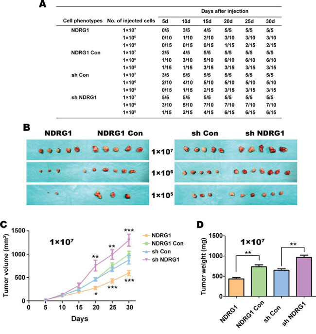 Figure 3: HT29 cells over-expressing NDRG1 are less tumorigenic in vivo in nude mice. A. Tumor formation ability of HT29 cells with NDRG1 over-expression or silencing was monitored every five days up to 30 days after injection into nude mice. Mice inoculated with cells over-expressing NDRG1 levels had lower rates of tumor incidence and tumor formation relative to the vector control or cells with NDRG1 silencing. B. Morphological observation of tumors formed after injection of nude mice with HT29 cells that have NDRG1 over-expression or silencing (i.e., NDRG1 vs. NDRG1 Con, sh Con vs. sh NDRG1) when injected s.c. at 1 × 105, 1 × 106 and 1 × 107 cells per mouse. C. Growth curve of tumors in nude mice (1 × 107 cells per mouse). Tumor diameters were measured every 5 days using Vernier calipers. D. Average weight of tumors taken from nude mice after 30 days of growth. All data are shown as mean ± SD (n = 5–15 mice/group). *p < 0.05; **p < 0.01; ***p < 0.001.