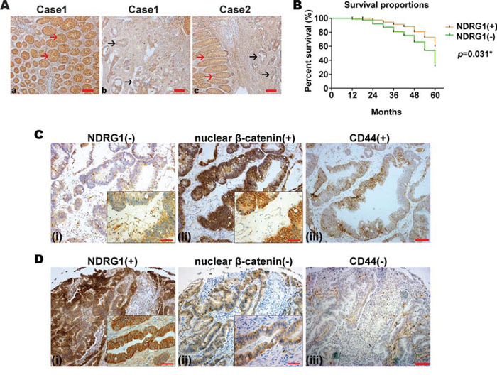 Figure 6: NDRG1 is negatively associated with tumorigenesis in CRC clinical specimens and with nuclear β-catenin and CD44 expression. A. Immunohistochemistry of colon tissue samples demonstrating that NDRG1 is highly expressed in the adjacent normal intestinal glands compared to CRC tissues in two representative cases (red arrows: normal glands; black arrows: CRC regions). Magnification: 200×. B. Survival of CRC patients with tumors positive or negative for NDRG1 for periods up to 60 months. C. Immunohistochemistry of CRC tissue samples from a representative patient with: (i) low NDRG1 (i.e., NDRG1(–)); (ii) high nuclear β-catenin (i.e., nuclear β-catenin(+)); and (iii) high total CD44 levels (i.e., CD44(+)). D. Immunohistochemistry of CRC tissue samples from a representative patient with: (i) high NDRG1 (i.e., NDRG1(+)); (ii) low nuclear β-catenin (i.e., nuclear β-catenin(–)); and (iii) low total CD44 levels (i.e., CD44(–)). Magnification: 200 ×. Scale Bar = 200 μm. Insets represent magnified images of each section (400x). Scale Bar = 100 μm.