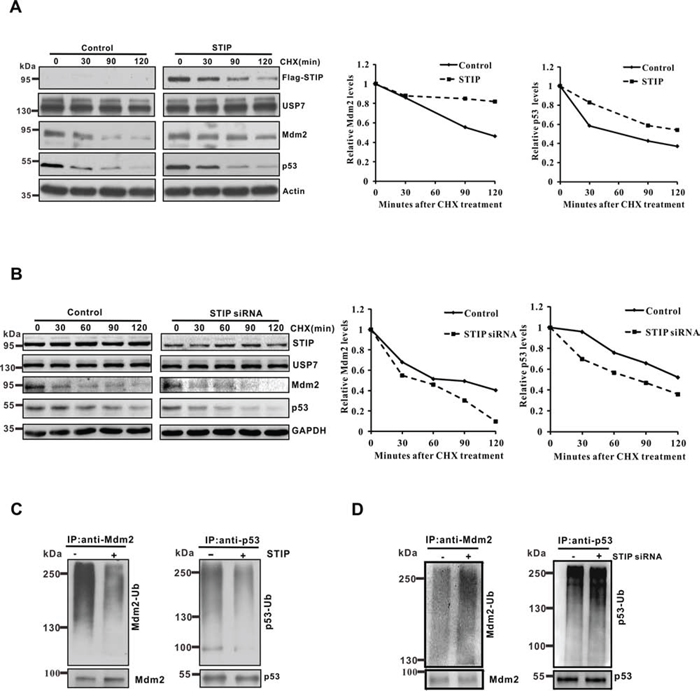 Figure 3: STIP modulates the protein stability of Mdm2 and p53 and their ubiquitination. A and B. U2OS cells transfected with the Flag-STIP plasmid (A) or STIP siRNA (B) were treated with CHX for indicated time points. To better compare the protein stability of Mdm2 and p53 under different conditions, the blots on the left and their corresponding ones on the right were exposed for different times to achieve similar band intensity at time 0. Right panel: quantification of the Mdm2 and p53 protein levels relative to GAPDH. C and D. U2OS cells transfected with the Flag-STIP plasmid (C) or STIP siRNA (D) were incubated with 20 μM MG132 for 4 h. Lysates were immunoprecipitated with anti-Mdm2 or anti-p53 antibodies. The ubiquitination of endogenous Mdm2 and p53 was analyzed by WB using an anti-ubiquitination antibody and either an anti-Mdm2 or an anti-p53 antibody.