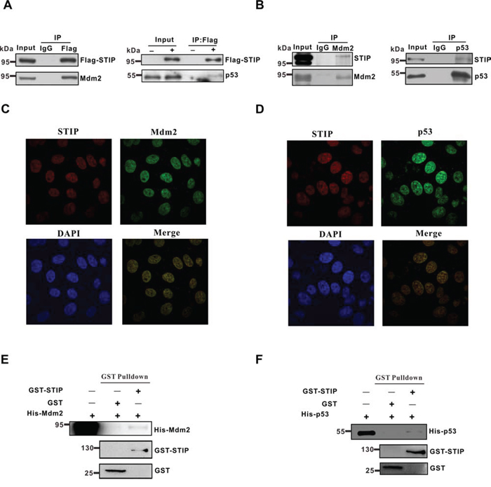 Figure 4: STIP directly interacts with Mdm2 or p53. A. U2OS cells were transfected with Flag-STIP or control vectors, and lysates were precipitated with anti-Flag and IgG antibodies. WB analysis of immunoprecipitates and total cell lysates probed with Mdm2 and p53 antibodies are shown. B. Endogenous STIP interacts with Mdm2 or p53. Lysates from U2OS cells were precipitated with anti-Mdm2 (left), anti-p53 (right), or control IgG antibodies. Immunoprecipitates and lysates were analyzed by WB with the indicated antibodies. C and D. U2OS cells were fixed and incubated with STIP and Mdm2 antibodies (C) or STIP and p53 antibodies (D), followed by staining with FITC- or Texas Red-conjugated IgG. DAPI was used for nuclear counterstaining. E and F. The GST and GST-STIP fusion protein were used in a GST pull down assay with in vitro translated Mdm2 (E) or p53 (F)