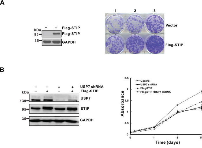 Figure 7: STIP promotes tumor cells growth in a USP7-dependent manner. A. U2OS cells were transfected with a plasmid encoding Flag-STIP or the parental vector followed by G418 selection. Following a 2-week selection, cells were fixed with methanol and stained with 0.1% crystal violet. Cell seeding density is 1.25 × 104/ml (lane 1), 2.5 × 104/ml (lane 2) and 5 × 104/ml (lane 3) respectively. B. U2OS cells infected with lentivirus encoding control or USP7 shRNA were transfected with a plasmid encoding Flag-STIP or the parental vector, and cell growth was monitored by MTT assays performed at the indicated time points.