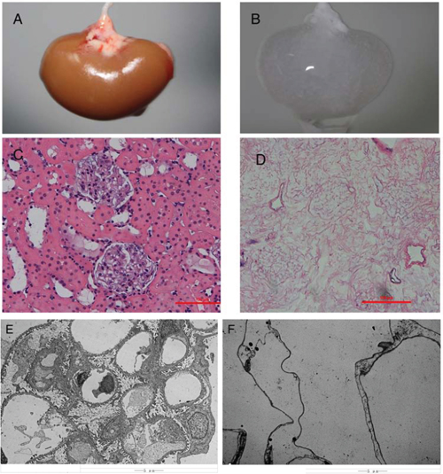 Figure 1: Decellularization of the rat kidney. A&B, Gross appearance of a kidney undergoing decellularization at the beginning A. and end B. of the decellularization process. Hematoxylin and eosin staining of sections of renal cortex before C. and after D. SDS decellularization shows the absence of any cellular content and the integrity of the architecture of glomerular and tubular structures within the scaffold. Transmission electron microscopy images of decellularized kidney demonstrating the absence of cellular components and the preservation of basement membranes integrity. E. normal kidney; F. decellularized kidney scaffold.