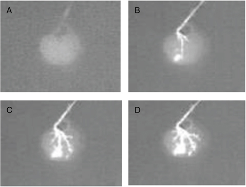 Figure 2: Fluoroangiography of a rat renal scaffold. The fluoroangiography denotes the vascular tree is well represented through its hierarchical organization. The contrast medium was perfused at a rate of 0.5 ml/min. A–D. shows the image at times 0 s, 30 s, 60 s, 90 s.