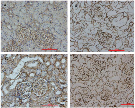 Figure 3: Localization of ECM proteins. Immunohistochemical stains of cadaveric rat kidney sections (A&C) and decellularized scaffold (B&D) showing the distribution of collagen IV (A&B) and fibronectin (C&D).