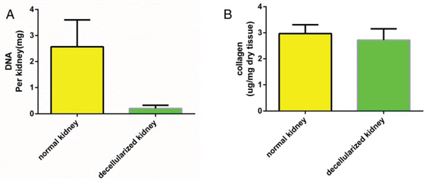 Figure 4: Quantitative assay of DNA and collagen content. Biochemical quantification of DNA and total collagen in cadaveric and decellularized rat kidney tissue showing a reduction of DNA content and a preservation of collagen after perfusion decellularization. Data are shown as the mean ± s.d. Statistical significance (p < 0.05) was determined by Student’s t test.