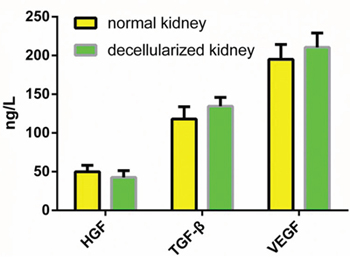 Figure 5: Quantitative assay of cytokines in DC kidney scaffolds. The level of HGF, TGF-b and VEGF in the DC kidney is not different from that of native kidney. Data are shown as the mean ± s.d. Statistical significance (p < 0.05) was determined by Student’s t test.