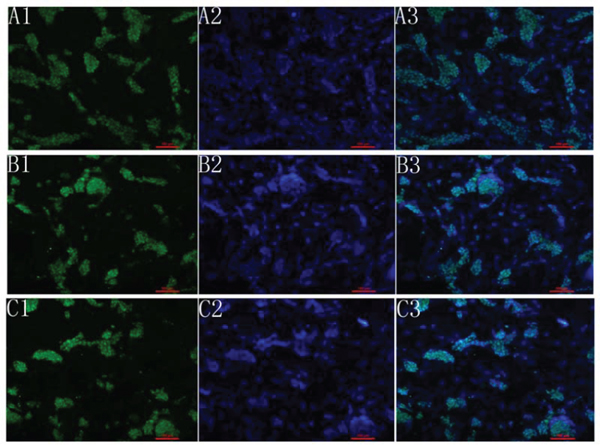 Figure 6: Fluorescence analysis of mES cells. A1, B1, C1 shows the expression of OCT4, Nanog and sox2. A2, B2, C2 shows the dapi staining. A3, B3, C3 shows the merge picture.
