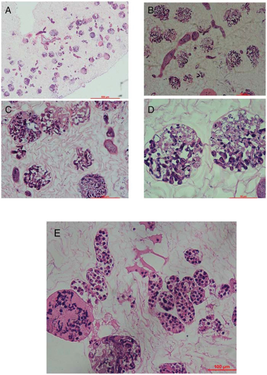 Figure 7: Recellularization of kidney scaffolds with mouse ES cells. Hematoxylin and eosin staining of kidney scaffold seeded with mouse ES cells show homogeneous distribution of cells into glomerular, vascular structures, peritubular capillaries, and tubules. A. shows the gross appearance. B–D. shows the glomeruli part and E. shows the renal tubule.